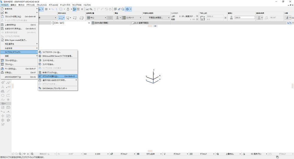3D DXF/DWGをインポートする際はファイル→ライブラリとオブジェクト→オブジェクトを開くを選択します。