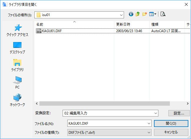 参照ウインドウのファイル種類にてDXF/DWGファイルを選択し、3Dファイルを開きます。